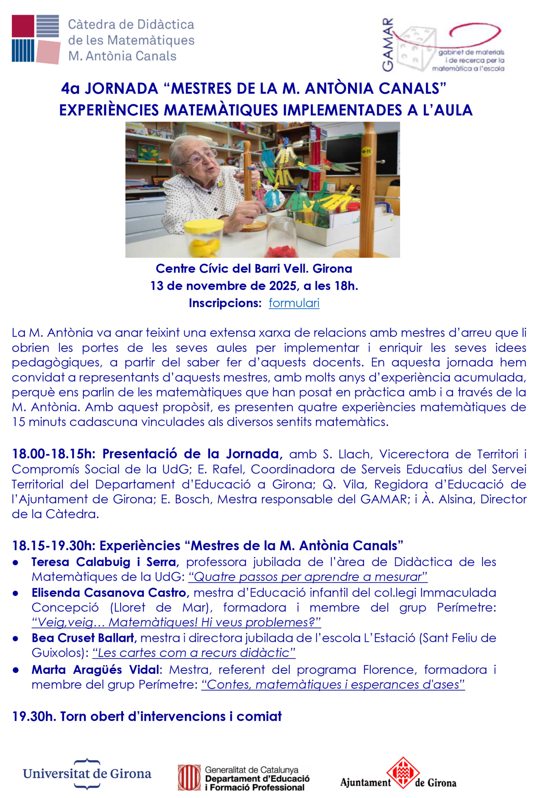 El 9 de novembre de 2023 a les 18h es va realitzar la jornada “Mestres de la M. Antònia Canals” Experiències matemàtiques implementades a l’aula al Centre Cívic del Barri Vell de Girona.